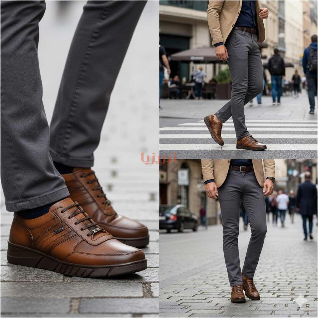 کفش چرم اصل تبریز با رویه چرم طبیعی، آستر چرم صنعتی، کفی سوئیت پارچه ای و زیره پی یو