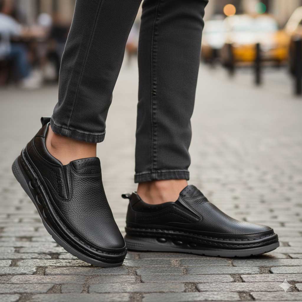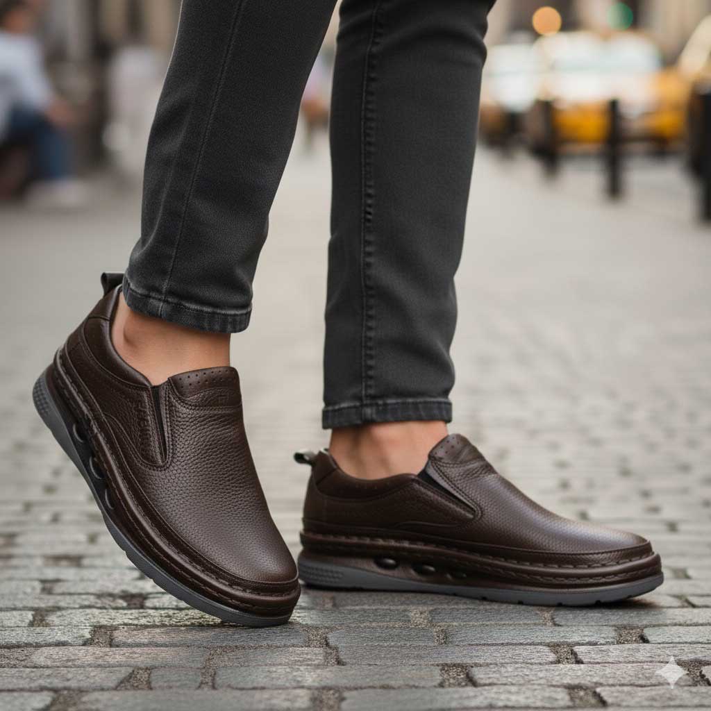 کفش چرم اصل تبریز با رویه چرم طبیعی، آستر چرم طبیعی، کفی طبی چرم طبیعی و زیره پی یو