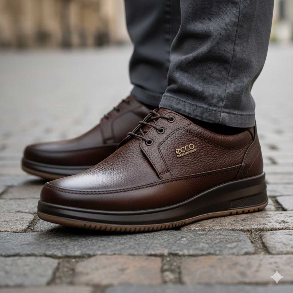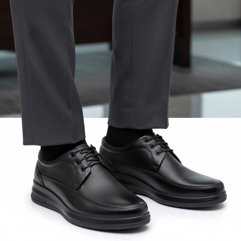 کفش چرم اصل تبریز با رویه چرم طبیعی، آستر چرم طبیعی یا چرم صنعتی، کفی طبی چرم طبیعی یا کفی سوئیت پارچه ای و زیره تزریق دورنگ