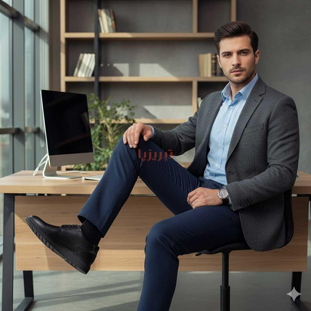کفش چرم اصل تبریز با رویه چرم طبیعی، آستر چرم طبیعی یا چرم صنعتی، کفی طبی چرم طبیعی یا کفی سوئیت پارچه ای و زیره تزریق