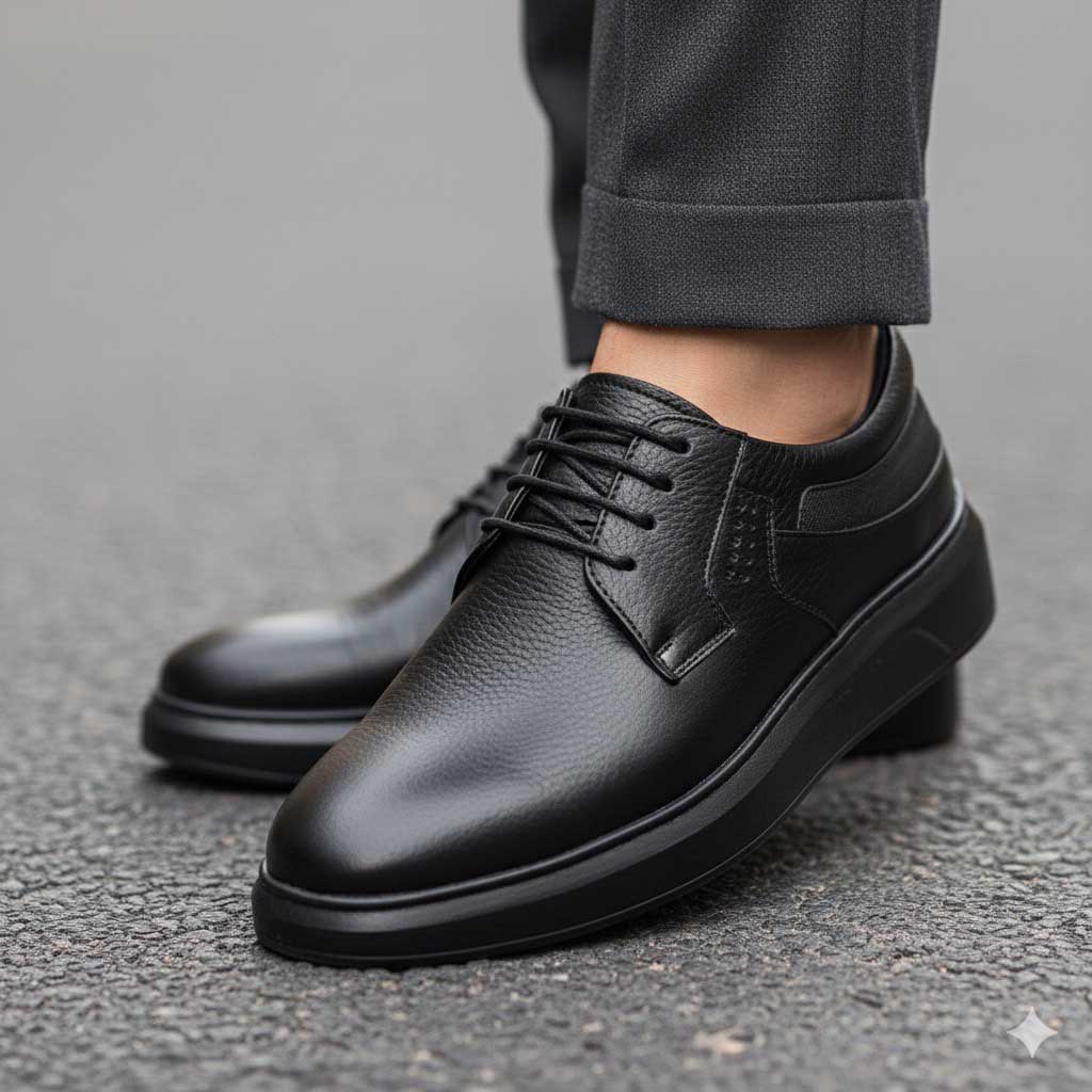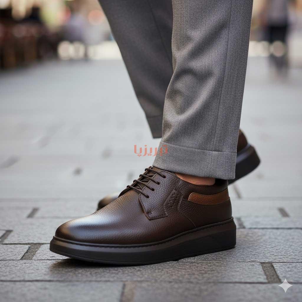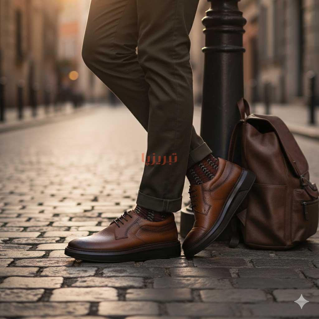 کفش چرم اصل تبریز با رویه چرم طبیعی، آستر چرم طبیعی، کفی طبی چرم طبیعی و زیره پی یو
